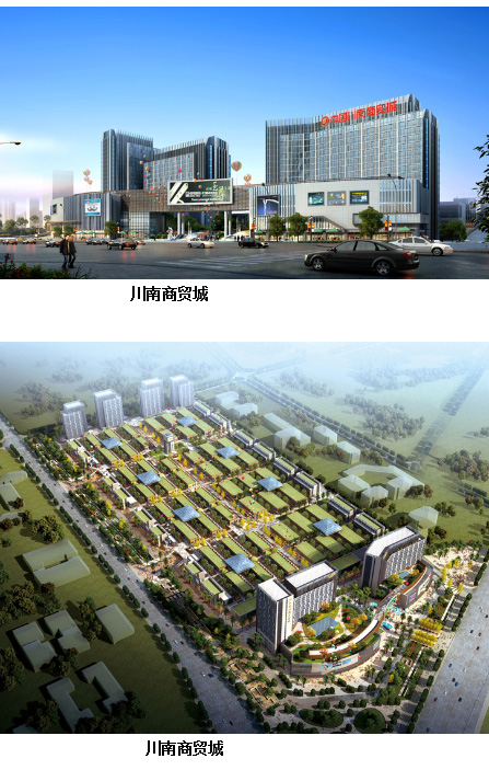 中国川南商贸城是亿联投资集团和四川友华科技集团联合出资,由自贡亿联置业投资有限公司开发建设。项目位于四川自贡市规划市场集群的核心,市场规划占地面积1800亩,建筑面积170万平方米。项目整体规划为大型市场交易、精品展示、综合商贸、仓储物流、商务办公、配套服务等功能区,其中以五金机电等轻工产品、城市综合等服务产品、仓储物流等配套产品为主要业态,形成集展示、交易、电子商务为一体的一站式综合商贸集散中心,是川南、滇东、黔北、渝西最具规模、交通最便捷、品类最齐全、配套最完善的城市综合商贸物流基地。