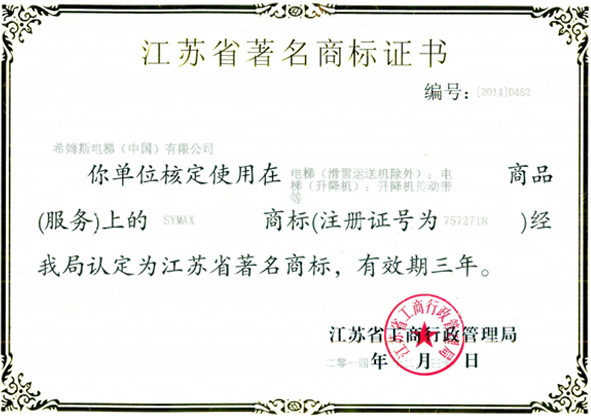 希姆斯电梯“SYMAX”商标经过几年的市场培育,其商标在相关公众中具有较高的认知程度,产品质量和服务均得到客户及同行的高度认可和积极好评。本次获得江苏省著名商标荣誉,大大提高我公司产品的知名度和市场竞争能力,将促进我司经济发展和产品的市场开拓。