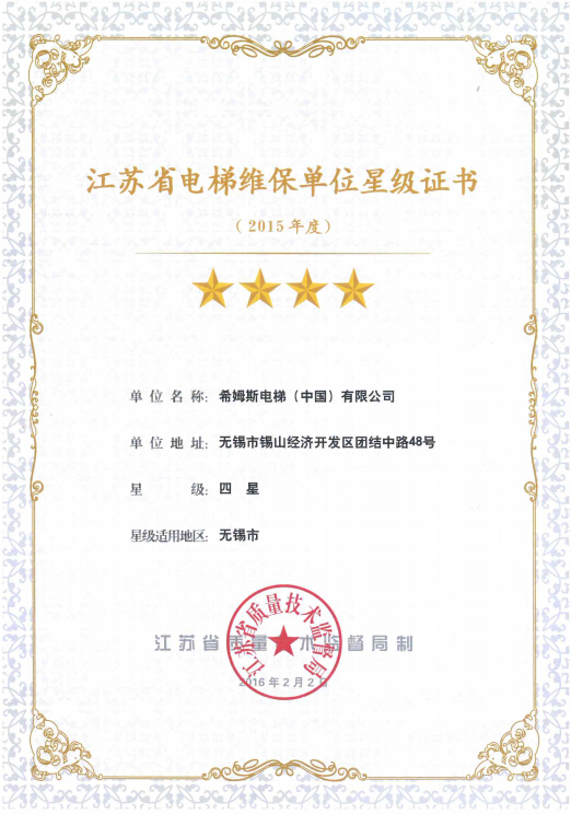 希姆斯电梯获得2015年无锡市电梯四星级维保单位
