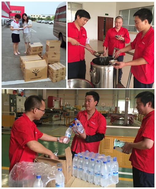 锡山开发区工会领导及时给我们送来了150份毛巾、花露水等夏令防暑用品发放给奋战在一线的员工,公司为了更好的加强后勤保障,帮助做好防暑降温工作,想方设法为员工营造清凉的工作环境,每天安排食堂熬制绿豆汤,并配备盐汽水和棒冰,给一线员工送清凉,让他们感到一缕缕舒心和凉意。