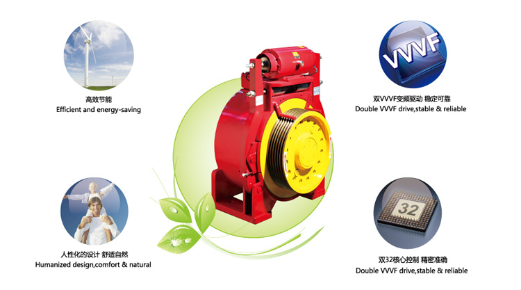 在电梯的设计、生产中,开发应用永磁同步电机,作为电梯的曳引电机,是一种技术的进步。其优点在于结构简单紧凑,少维护和安全可靠性高,同时它对环境的噪声污染低、无油脂污染,并能提高电力功率因素,是理想的环保产品。提高了机械传动效率,使用节能、经济,具有较高的性价比,在与交流无齿轮异步电动机驱动系统相比,它具有低速性、快速性、硬机械特性和停车自闭等优点,是异步电动机所无法相比的。它与直流无齿轮电动机驱动系统相比,具有更高的低速性能,调速精度、快速响应性能,且寿命长、耗电少、维护简单。此外,它还是易于实现低转速、大转矩的电梯理想驱动模型。
